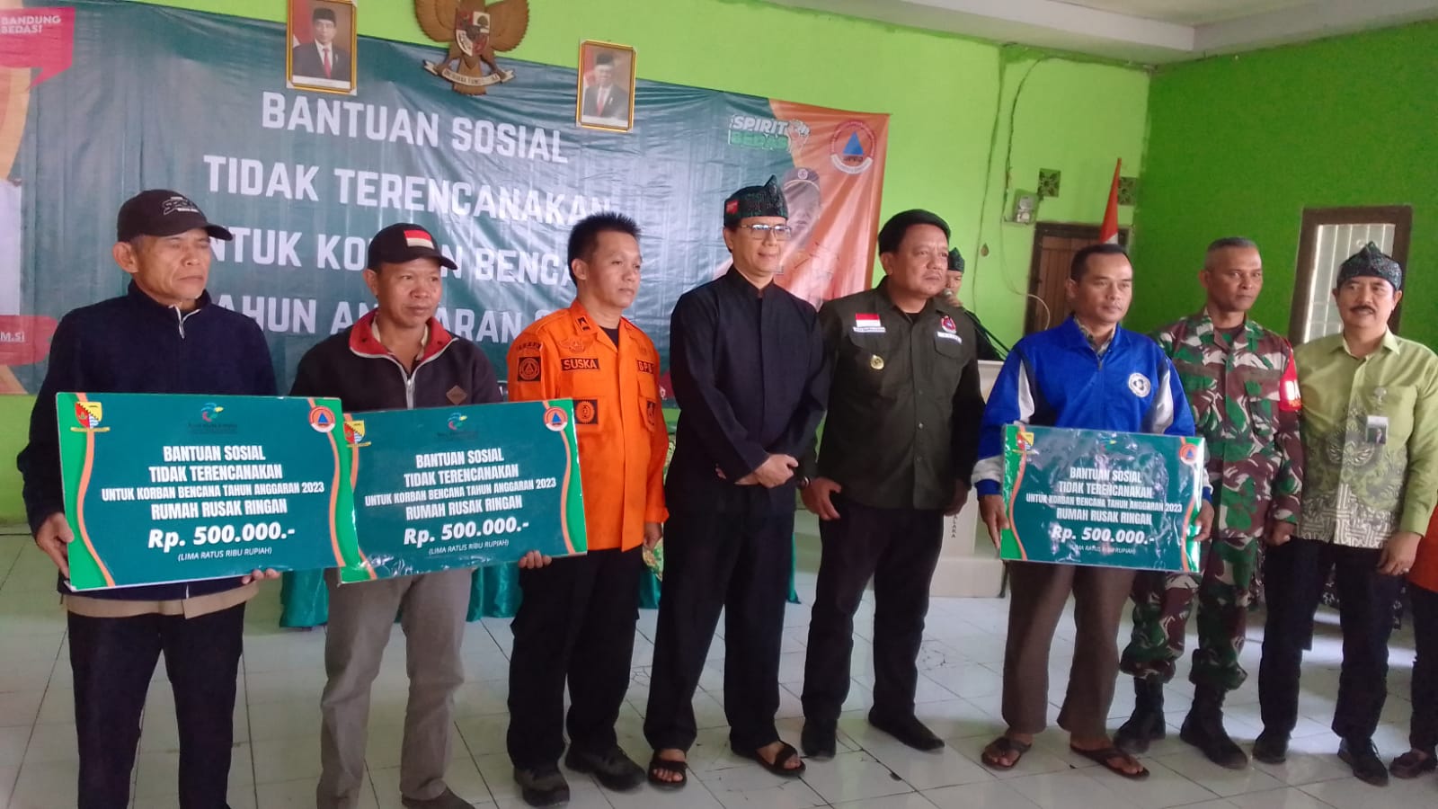 Badan Penanggulangan Bencana Daerah (BPBD) Kabupaten Bandung, Jawa Barat, secara simbolis memberikan bantuan sosial (Bansos) kepada 297 warga Desa Bojong Malaka, Rancamanyar dan Melurahan Andir, Kecamatan Baleendah, Kabupaten Bandung. Bansos itu dibagikan kepada.warga yang terkena bencana angin puting beliung beberapa bulan lalu sebesar Rp.500 ribu per unit.
