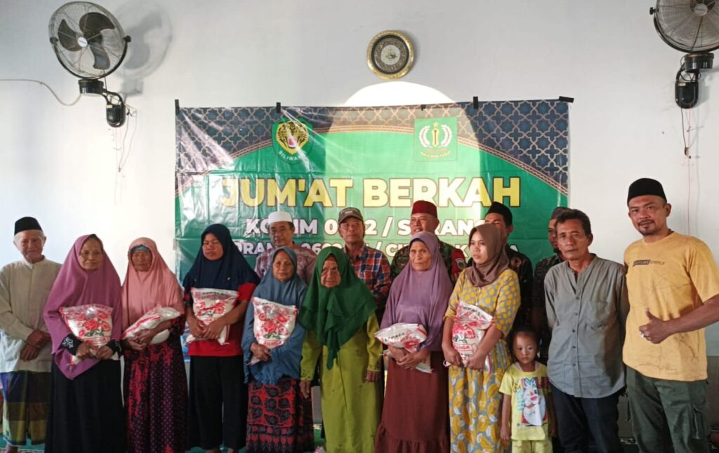 Berbagi kebahagiaan di Jum’at Berkah, Bintara Pembina Desa (Babinsa) Koramil 0602-05/Cipocok Jaya, Kodim 0602/Serang, Sersan Dua (Serda) Susilo, melaksanakan kegiatan Bakti Sosial (Baksos), dengan memberikan bantuan sembako beras 5 Kilogram sebanyak 170 karung, kepada lansia, anak yatim, tukang becak dan masyarakat yang kurang mampu. Kegiatan itu bertempat di Lingkungan Kampung Panggang, Kelurahan Panancangan Kecamatan Cipocok Jaya, Kota Serang, Provinsi Banten, pada Jum’at (22/9/2023).