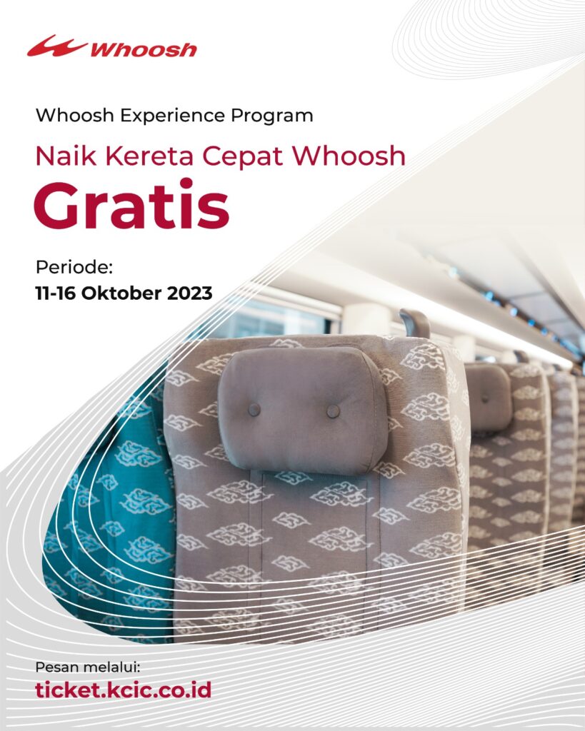 Whoosh Experience Program terus mendapat sambutan hangat dari masyarakat. Setelah sukses dengan tahap pertama pada 3-7 Oktober 2023 dan tahap 2 pada 8-10 Oktober 2023 dengan total penumpang mencapai 18 ribu orang, KCIC kembali membuka kesempatan kepada masyarakat yang ingin merasakan pengalaman perjalanan Jakarta-Bandung dengan Kereta Cepat pertama di Asia Tenggara secara gratis untuk periode 11-16 Oktober 2023.