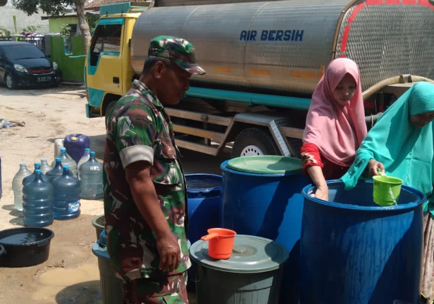 Bintara Pembina Desa (Babinsa), Koramil 0602-03/Walantaka, Kodim 0602/Serang, Sertu Kuswara, bersama PT. Mahoni Bangun Sentosa (MBS), mendistribusikan bantuan air bersih kepada warga yang terdampak kemarau akibat fenomena El Nino, Kegiatan itu bertempat di Kampung Ampel, Kelurahan Pengampelan Kecamatan Walantaka, Kota Serang, Provinsi Banten, pada Selasa (17/10/2023).