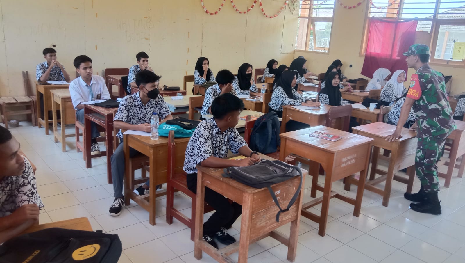 Untuk meningkatkan semangat belajar dan rasa kecintaan terhadap bangsa dan negara, Sertu Ahdi Bintara Pembina Desa (Babinsa) Koramil 0602-18/Kragilan Kodim 0602/Serang, memberikan materi tentang Wawasan Kebangsaan (Wasbang) kepada siswa siswi SMA Negeri 1 Kragilan, bertempat di Aula SMA Negeri 1 Kragilan Desa Pematang Kecamatan Kragilan Kabupaten Serang Provinsi Banten, Rabu (18/10/2023).