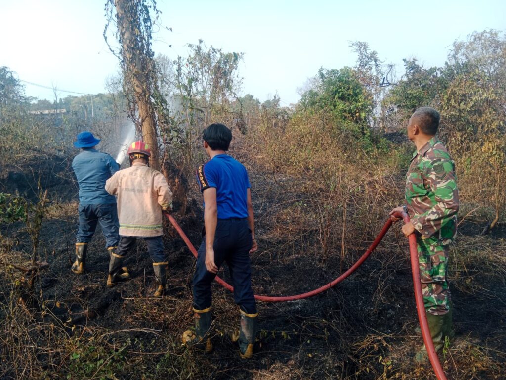 Babinsa Koramil 0602-05/Cipocok Jaya, Sertu Iman Setiawan bersama anggota pemadam kebakaran dan warga sigap membantu memadamkan api yang membakar lahan milik warga.