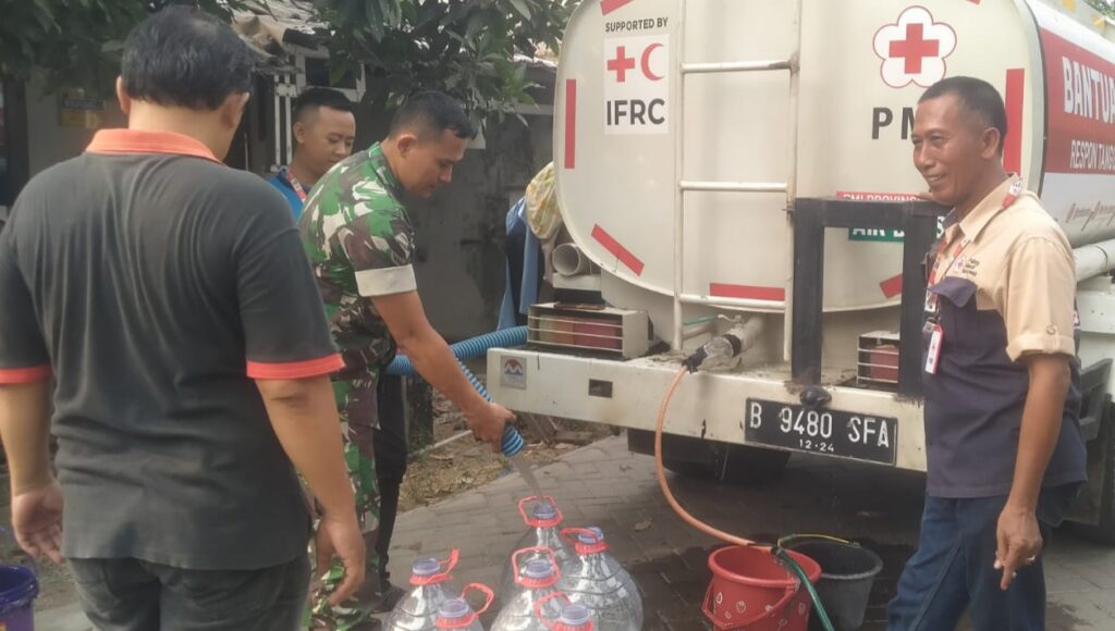 Untuk mengatasi terjadinya krisis air bersih, Sersan Dua (Serda) Atang Bintara Pembina Desa (Babinsa) Koramil 0602-01/Kota Serang Bersama Palang Merah Indonesia (PMI) Kota Serang, menyalurkan bantuan air bersih kepada masyarakat yang terdampak kekeringan akibat kemarau panjang dampak El Nino, bertempat di Lingkungan Perumahan Lebak Indah, Kelurahan Terondol, Kecamatan Serang, Kota Serang Provinsi Banten, pada Kamis (26/10/2023).