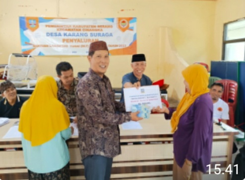 Kepala Desa Karang Suraga, Kecamatan Cinangka, Kabupaten Serang, Provinsi Banten, Cucun Cunaefi, SE, bersama dengan Pendamping Desa Kecamatan Cinangka, Ketua BPD. Perangkat Desa dan Tokoh Masyarakat, menyalurkan Bantuan Langsung Tunai Fana Desa (BLTDD).