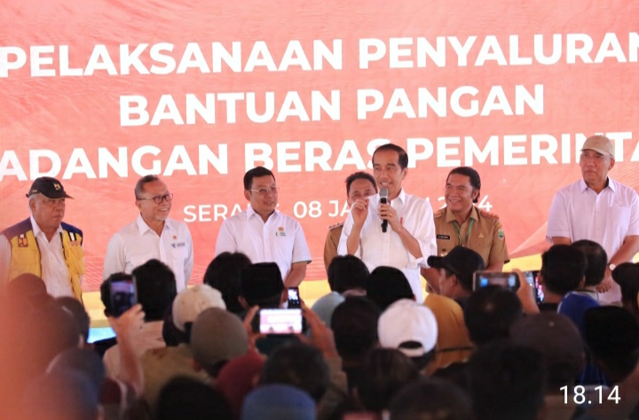 Penjabat (Pj) Gubernur Banten, Al Muktabar mendampingi Presiden RI Joko Widodo, meninjau Gudang Beras Bulog (GBB) Umbul Tengah Sub Divre Serang di Jl Raya Cilegon Km. 3,5 Drangong, Kota Serang, pada Senin, (08/01/2024). Presiden Jokowi juga melakukan penyerahan bantuan pangan Cadangan Beras Pemerintah (CBP) kepada masyarakat Keluarga Penerima Manfaat (KPM) di Kota Serang.