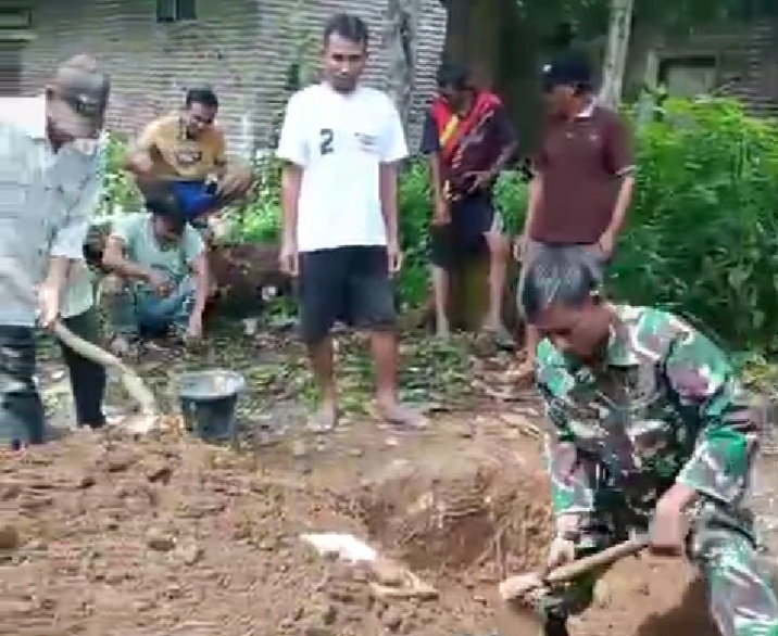 Bersama warga Kampung Umbul Kaung, Desa Ranca Sanggal, Babinsa Koramll 2305/Cinangka, Pelda Sa’in berjibaku ikut memvantu warga untuk menggali liang kubur.