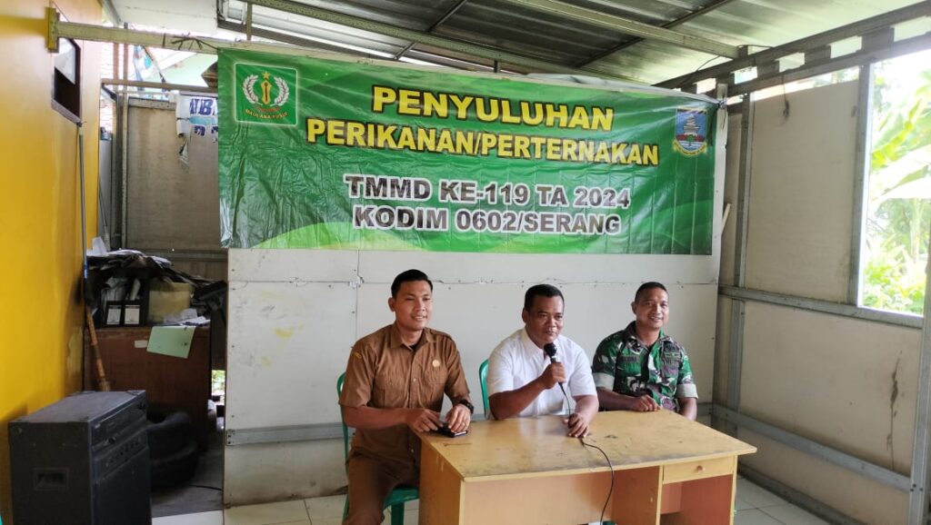 Satuan Penugasan (Satgas) TNI Manunggal Membangun Desa (TMMD) Ke-119 Kodim 0602/Serang, menggelar Penyuluhan Perikanan dan Peternakan. Kegiatan itu bekerjasama dengan Pemerintah Kabupaten (Pemkab) Serang dan Instansi terkait lainnya. Tujuannya guna meningkatkan swasembada pangan daerah setempat melalui perikanan dan peternakan yang dilaksanakan di Desa Bojong Pandan, Kecamatan Tunjung Teja, Kabupaten Serang, Provinsi Banten, pada Selasa (27/2/2024).