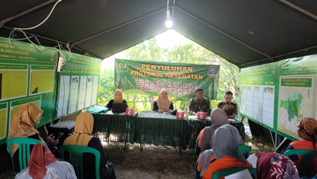 Untuk meningkatkan budaya hidup sehat, Penyuluhan Protokol Kesehatan (Prokes-red) menjadi salah satu sasaran non fisik kegiatan TNI Manunggal Membangun Desa (TMMD) ke-119 Kodim 0602/Serang bersama Pemerintah Daerah Kabupaten Serang, melalui instansi terkait, yang disampaikan kepada seluruh masyarakat. Kegiatan itu bertempat di Desa Bojong Pandan, Kecamatan Tunjung Teja, Kabupaten Serang, Provinsi Banten, pada Jum’at (01/3/2024).
