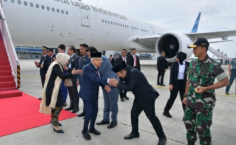 Penjabat (Pj) Gubernur Banten, Al Muktabar sambut kedatangan Wakil Presiden (Wapres) Ma’ruf Amin bersama Ibu Wury Ma’ruf Amin beserta rombongan dari Kunjungan Kenegaraan ke Selandia Baru dalam rangka diplomasi industri halal. Pesawat Kepresidenan GA-02 Boeing 777-300ER mendarat di Bandara Soekarno Hatta, Kota Tangerang pada pukul 14.40 WIB, pada Minggu (2/3/2024).