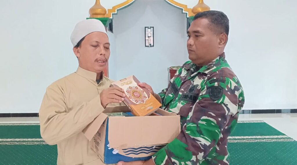 Satgas TMMD Ke-119 Kodim 0602/Serang menyerahkan bantuan kitab suci Al-Qur’an kepada Musholla Ass-Syuhada di Kampung Bedeng, Desa Bojong Pandan, Kecamatan Tunjung Teja, Kabupaten Serang, Provinsi Banten, pada Sabtu (16/3/2024).