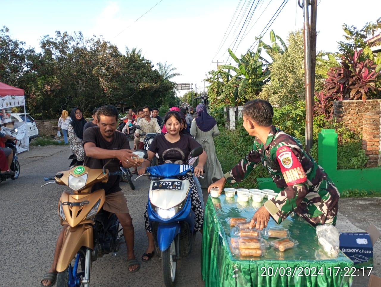 Bintara Pembina Desa (Babinsa) Koramil 0602-09/Cikeusal Kodim 0602/Serang Sersan Satu (Sertu) Rahman Adibrata, melaksanakan kegiatan sosial dengan memberikan ratusan ta’jil gratis untuk berbuka puasa kepada warga, bertempat di depan Makoramil 0602-09/Cikeusal Kecamatan Cikeusal, Kabupaten Serang Provinsi Banten, pada Kamis (21/3/2024).
