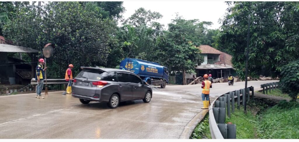 Di saat musim penghujan seperti saat ini, PT Sino Road And Bridge lakukan Penyiraman jalan Raya Saketi- Malingping Kabupaten Pandeglang, Banten, tepatnya di wilayah Cijakan, secara rutin untuk mengantisipasi agar jalan tetap aman bagi penguna jalan, baik dari arah Saketi- Malingping maupun sebaliknya. membersihkan jalan raya yang di lintasi proyek jalan tol dengan menyiram jalan agar partikel debu yang berceceran di jalan raya tetap bersih sehingga lalin lancar dan aman, selain itu tampak petugas stand by mengatur arus lalin.