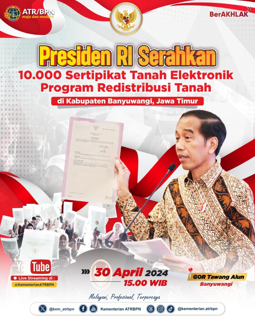 Yuk, kita saksikan melalui Youtube Streaming @KementerianATR/BPN, yang disiarkan secara langsung dari GOR Tawangalun, Kabupaten Banyuwangi, Pukul 15.00 WIB, pada Selasa (30/04/2024