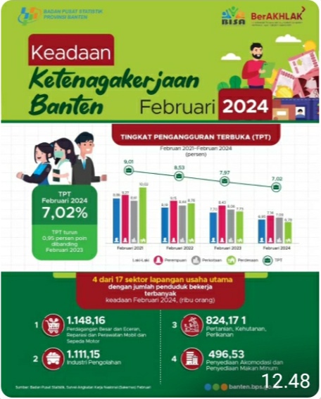 Berdasarkan Berita Statistis Badan Pusat Statistik Provinsi Banten, pada Senin,(6/5/2024), Tingkat Pengangguran Terbuka (TPT) Provinsi Banten mengalami tren penurunan. dari periode Agustus 2020 hingga Februari 2024. Akibat pandemi covid-19, TPT Provinsi Banten sempat sentuh 10,64 persen. Seiring meningkatnya aktivitas produksi, TPT Provinsi Banten kini di angka 7,02 persen.