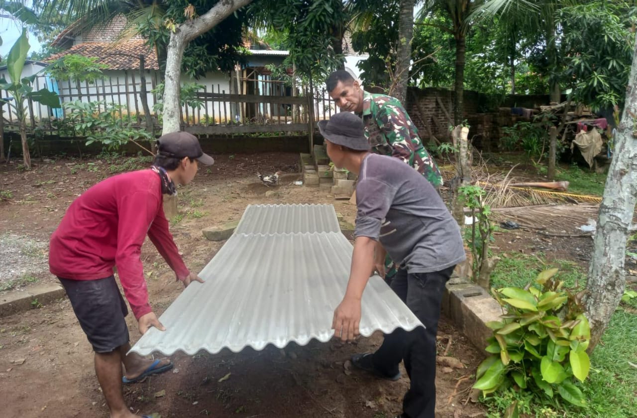 Bintara Pembina Desa (Babinsa) Koramil 0602-04/Taktakan Kodim 0602/Serang Sersan Satu (Sertu) Gaspar Morais, secara Bergotongroyong membantu proses perbaikan rumah warganya bernama Junaedi yang rusak akibat terjadi hujan disertai cuaca ekstrim, bertempat di Linkungan Balebatu Kelurahan Lialang, Kecamatan Taktakan Kota serang Provinsi Banten, Rabu (15/5/2024).