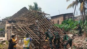 Sejumlah prajurit TNI AD yang bertugas di Kodim 0602/Serang, tampak mulai merobohkan rumah milik Kartini berumur sekitar 80 tahun seorang Warakawuri TNI, melalui program Perehaban Rumah Tidak Layak Huni (Rutilahu) bekerjasama dengan PT Indah Kiat, bertempat di Lingkungan Sumber Harum RT 02 RW 07 Kelurahan Cipare Kecamatan Cipare, Kota Serang Provinsi Banten, pada Minggu (02/6/2024).