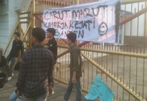 Aksi demonstrasi Mahasiswa yang tergabung dalam.wadah Kumala Perwakilan Serang itu sempat menerobos pintu gerbang Kejati Banten. Namun, mereka dihalangi oleh para petugas Kejati Banten.