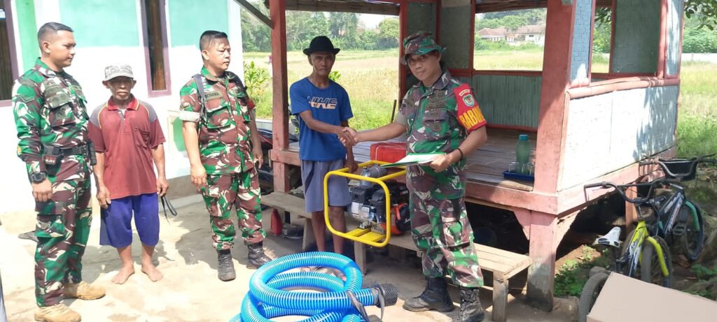 Bintara Pembina Desa (Babinsa) 0602-08/Petir. Kodim 0602/Seramg, Sersan Satu.(Sertu) Iwan Fahruroji, melaksanakan kegiatan Pendampingan Pertanian bersama Kelompok Tani.(Poktan) Simpati. dan menyerahkan bantuan berupa mesin pompa air, pada Jum’at (7/6/2024).