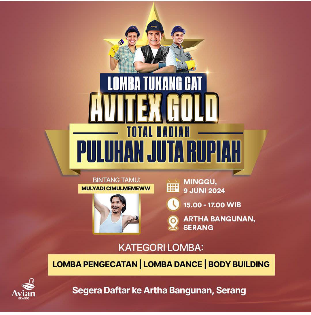 Artha Bangunan Kota Serang, Banten, menggelar lomba Avitex Gold dengan total hadiah jutaan rupiah, pada Minggu, (9/6/2024) mulai jam 15.00 sampai dengan 17.00 WIB.