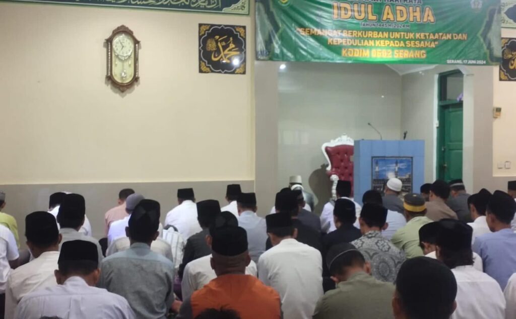Dalam rangka terus meningkatkan keimanan dan ketaqwaan Prajurit Dan PNS serta keluarganya, Kodim 0602/Serang menggelar kegiatan ibadah sholat Idul Adha 1445 H Tahun 2024, bertempat di Mesjid Al Aqsha Makodim 0602/Serang Kecamatan Cipocok Jaya Kota Serang, Provinsi Banten, pada Senin (17/6/2024).