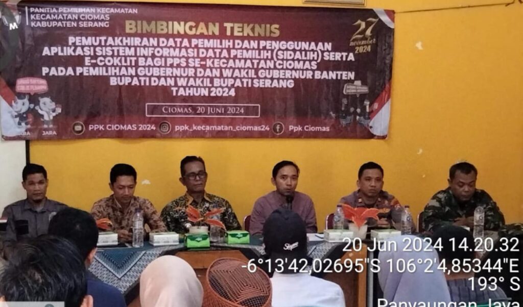 Turut hadir dalam kegiatan tersebut Camat Ciomas, H. Ugun Gumilar, Kapolsek Ciomas, Iptu Fridy Romadana, Komisioner Komisi Pemilihan Umum (KPU) Kabupaten Serang, H. Asmawi, Panwascam Ciomas, Iwan Suryani, dan Ketua PPK Ciomas serta PPS seluruh Kecamatan Ciomas.