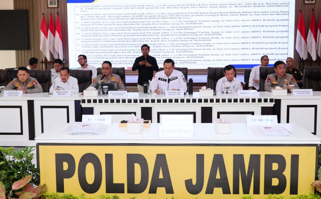 Hadir dalam Konferensi Pers Pengungkapan Tindak Pidana Pertanahan di Jambi, sejumlah Pejabat Pimpinan Tinggi Madya dan Pratama Kementerian ATR/BPN, termasuk Ketua Satgas Anti-Mafia Tanah; Gubernur Jambi beserta jajaran aparat penegak hukum (APH) Provinsi Jambi; serta Kepala Kantor Wilayah BPN Provinsi Jambi beserta jajaran.