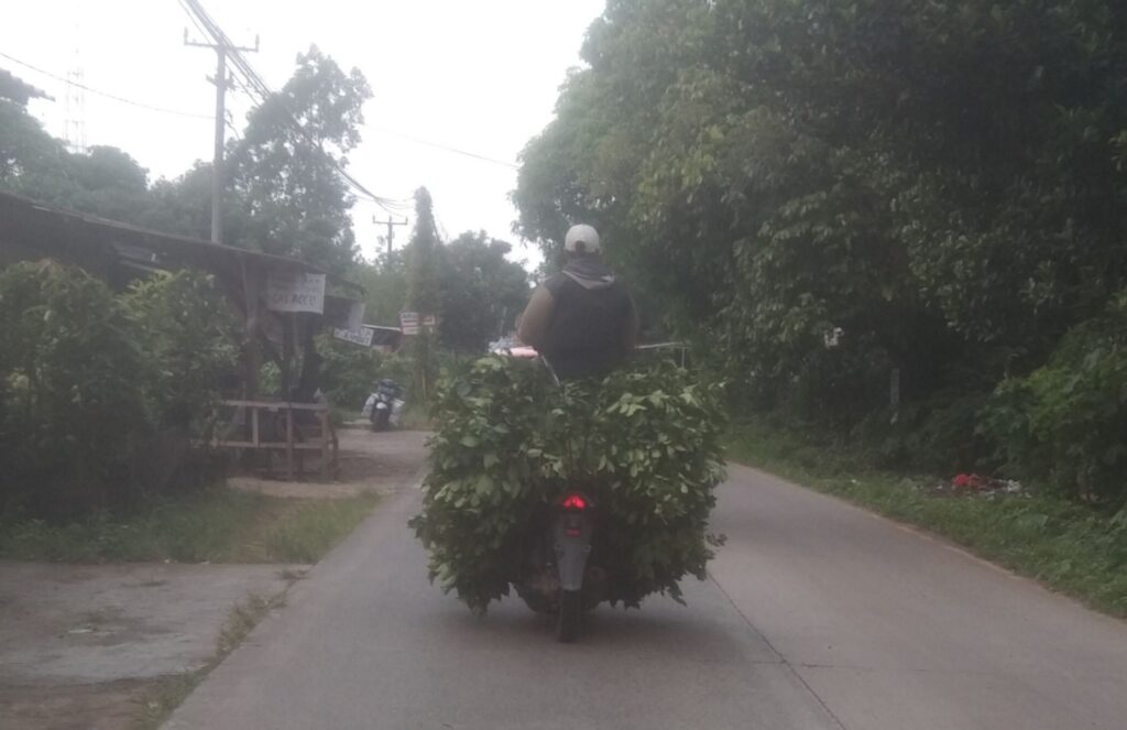 SALAH seorang pengendara sepeda motor tengah melintas di jalan raya di Desa Tunjung Teja, Kecamatan Tunjung Teja, Kabupaten Serang, Banten, pada Jum’at (28/6/2024). Tampak sepeda motor itu tengah mengangkut daun salam dengan jumlah yang melebihi kapasitas. Tak ayal, akibatnya penunpangnya pun terpaksa harus duduk di atas daun salam tersebut. (Foto : Hairuzaman).