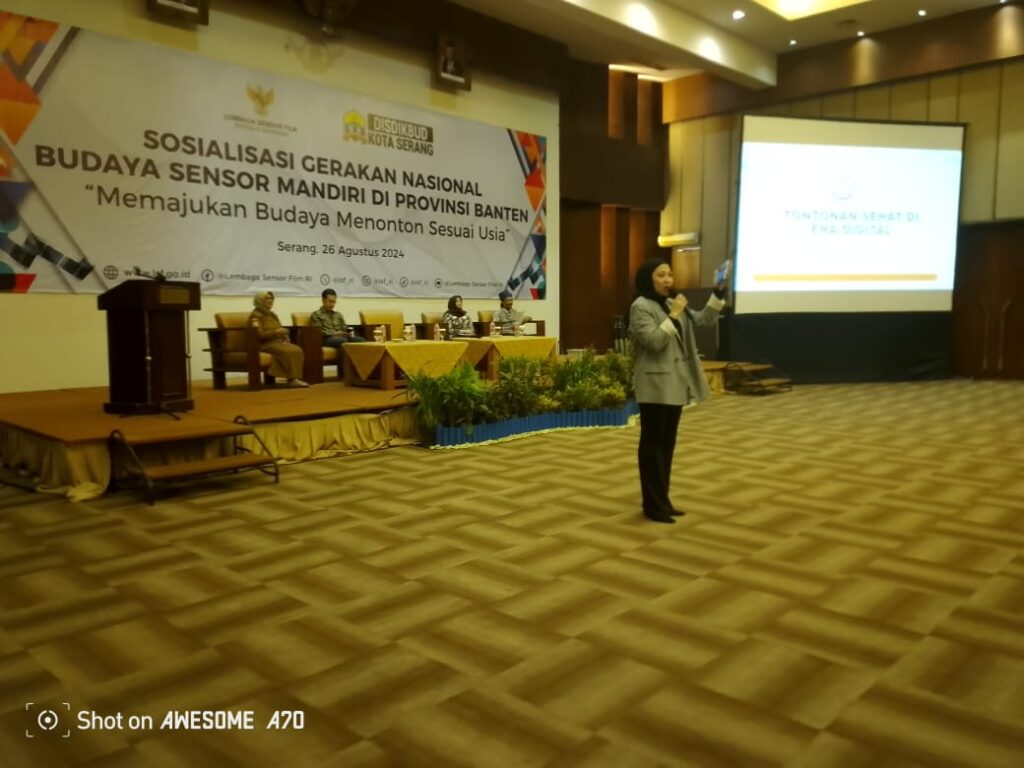 Komisioner Komisi Penyiaran Indonesia (KPI) Pusat Bidang Kelembagaan, Evri Rizqi Monarshi, S.KM, menghadiri kegiatan Sosialisasi Gerakan Nasional Budaya Sensor Mandiri Di Provinsi Banten yang digelar di Hotel Horison Kota Serang pada Senin, 26 Agustus 2024. Dalam kesempatan tersebut, Monarshi menegaskan tugas KPI dalam pengawasan lembaga penyiaran di frekuensi publik dan membahas perbedaan tugas dengan Lembaga Sensor Film (LSF) RI.