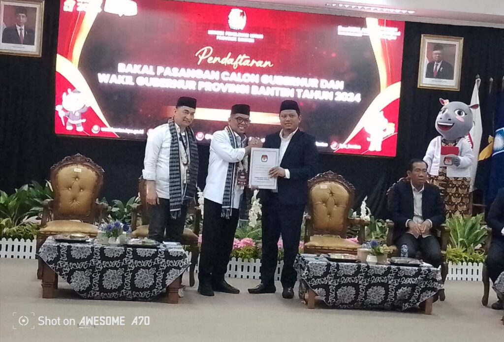 Andra Soni, SM, M.Si, bersama Dr. H. Raden Achmad Dimyati Natakusuma, SH, MH, M.Si, hari ini resmi mendaftarkan diri sebagai calon gubernur dan wakil gubernur Provinsi Banten di Kantor Komisi Pemilihan Umum (KPU) Provinsi Banten, pada Kamis.(29/8/2024).
