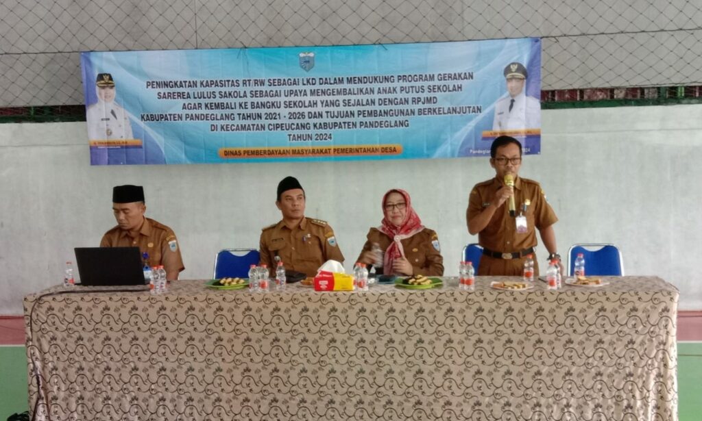 Acara sosialisasi peningkatan kapasitas Lembaga Kemasyarakatan Desa (LKD) disampaikan oleh narasumber yakni, terdiri dari Camat Cipeucang, Korwil Disdikpora, Kapolsek dan Kepala KUA. Dengan adanya sosialisasi ini diharapkan dapat meningkatkan angka partisipasi murni dan tingkat penyelesaian sekolah pada jenjang pendidikan dasar