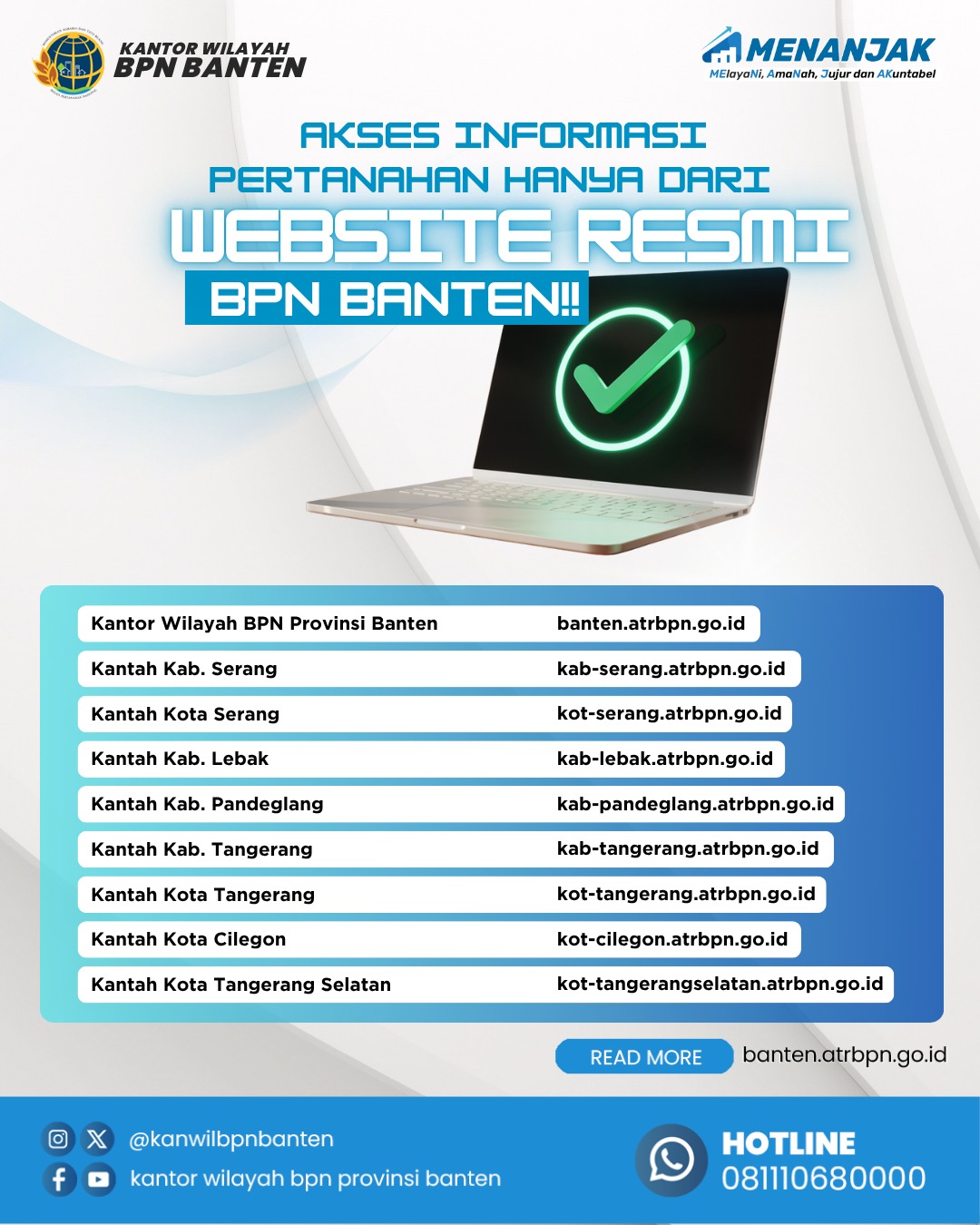 Ia meminta masyarakat mengakses informasi seputar pertanahan dan tata ruang pada website resmi satker di Lingkungan Kantor Wilayah BPN Provinsi Banten yaitu: