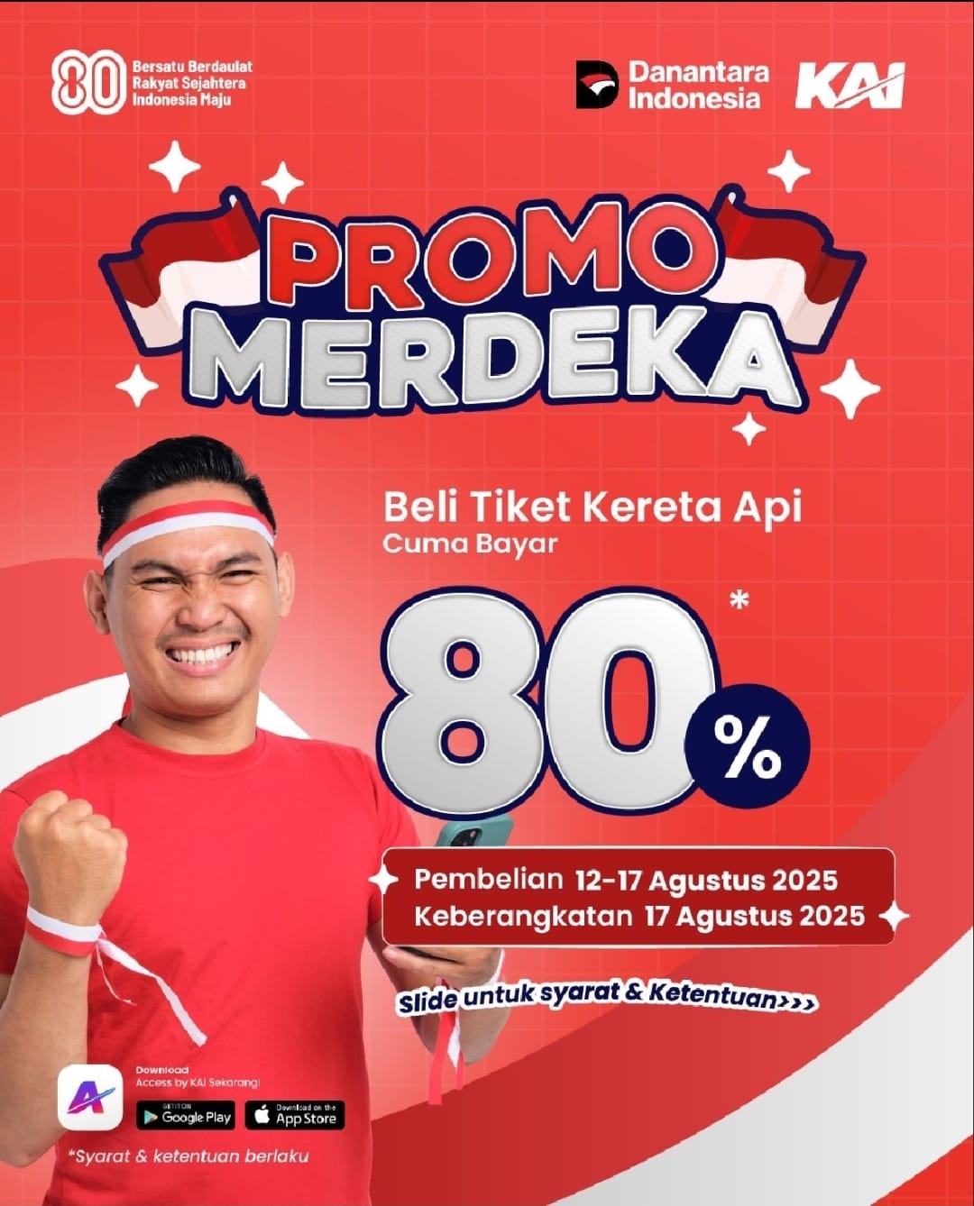 Dalam rangka memeriahkan Hari Ulang Tahun Kemerdekaan Republik Indonesia ke-80 , PT Kereta Api Indonesia (Persero) menghadirkan Promo Merdeka berupa potongan harga tiket sebesar 20% sehingga pelanggan hanya membayar 80% dari tarif normal. Promo ini berlaku untuk perjalanan kereta api pada 17 Agustus 2025.