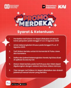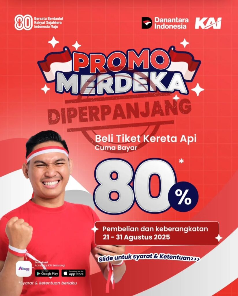 Ada kabar gembira dari PT Kereta Api Indonesia (Persero)! Promo Merdeka yang sebelumnya dilaksanakan untuk menyambut momen 17 Agustus-an dimana calon penumpang cukup membayar 80% dari harga tiket untuk keberangkatan akan diperpanjang ke periode 21-31 Agustus 2025.