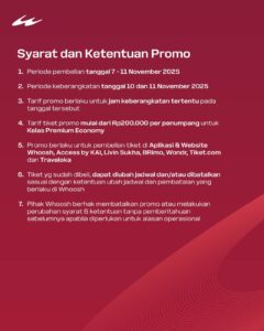 Promo ini berlaku untuk pemesanan tiket pada 7–11 November 2025 melalui Aplikasi Whoosh dan situs resmi ticket.kcic.co.id, serta kanal mitra resmi Access by KAI, Livin’ Sukha, BRImo, Wondr by BNI, Tiket.com, dan Traveloka, dengan periode keberangkatan pada 10-11 November 2025.