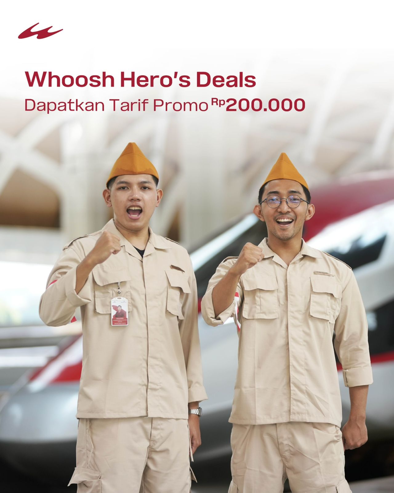 Dalam rangka memperingati Hari Pahlawan 10 November, KCIC menghadirkan promo spesial bertajuk “Whoosh Hero’s Deal” sebagai bentuk apresiasi kepada masyarakat yang telah menjadikan Whoosh sebagai moda transportasi modern pilihan utama. Melalui promo ini, penumpang dapat menikmati perjalanan cepat dan nyaman dengan harga tiket mulai dari Rp200.000 untuk kelas Premium Economy.