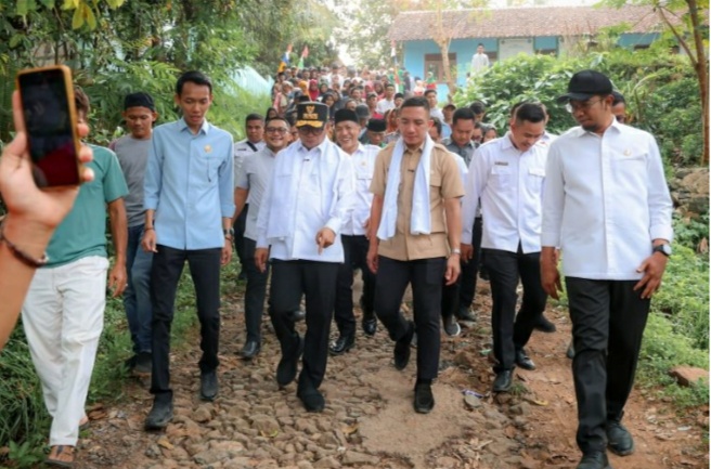 Gubernur Banten, Andra Soni, didampungi Kepala DPUPR Banten, Arlan Marzan, dan Kepala DPUPR Kaabupaten Lebak, Irvan Suyatufika, meninjau Jalan Poros Desa Karyajaya, Kecamatan Cimarga, Kabupaten Lebak, pada Rabu (27/8/2025). Jalan yang akan tersentuh Program Bangun Jalan Desa Sejahtera (Bang Andra) Pemerintah Provinsi Banten.