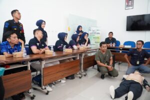 Para peserta juga mengikuti sesi praktik langsung, meliputi pemeriksaan awal kondisi korban, teknik CPR (cardiopulmonary resuscitation), pemasangan perban dan bidai, serta simulasi pemindahan korban secara aman. Selama praktik, peserta didampingi instruktur untuk memastikan setiap tahapan dilakukan sesuai standar prosedur.