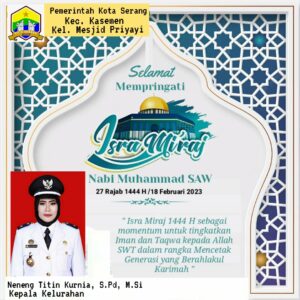 Lurah Mesjid Priyayi, Kec. Kasemen, Kota Serang, Mengucapkan Selamat Memperingati Isra Mi’raj 1444 H/2023 M February 20, 2023February 20, 2023 Redaksi